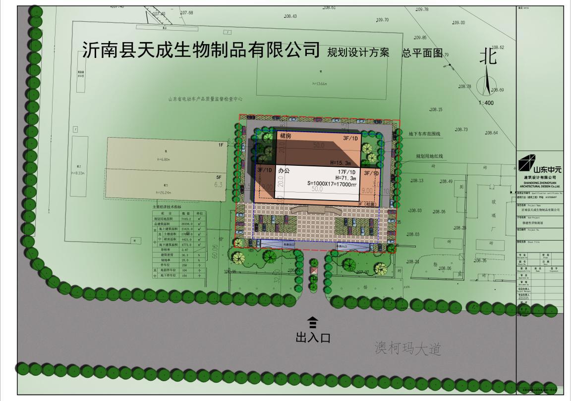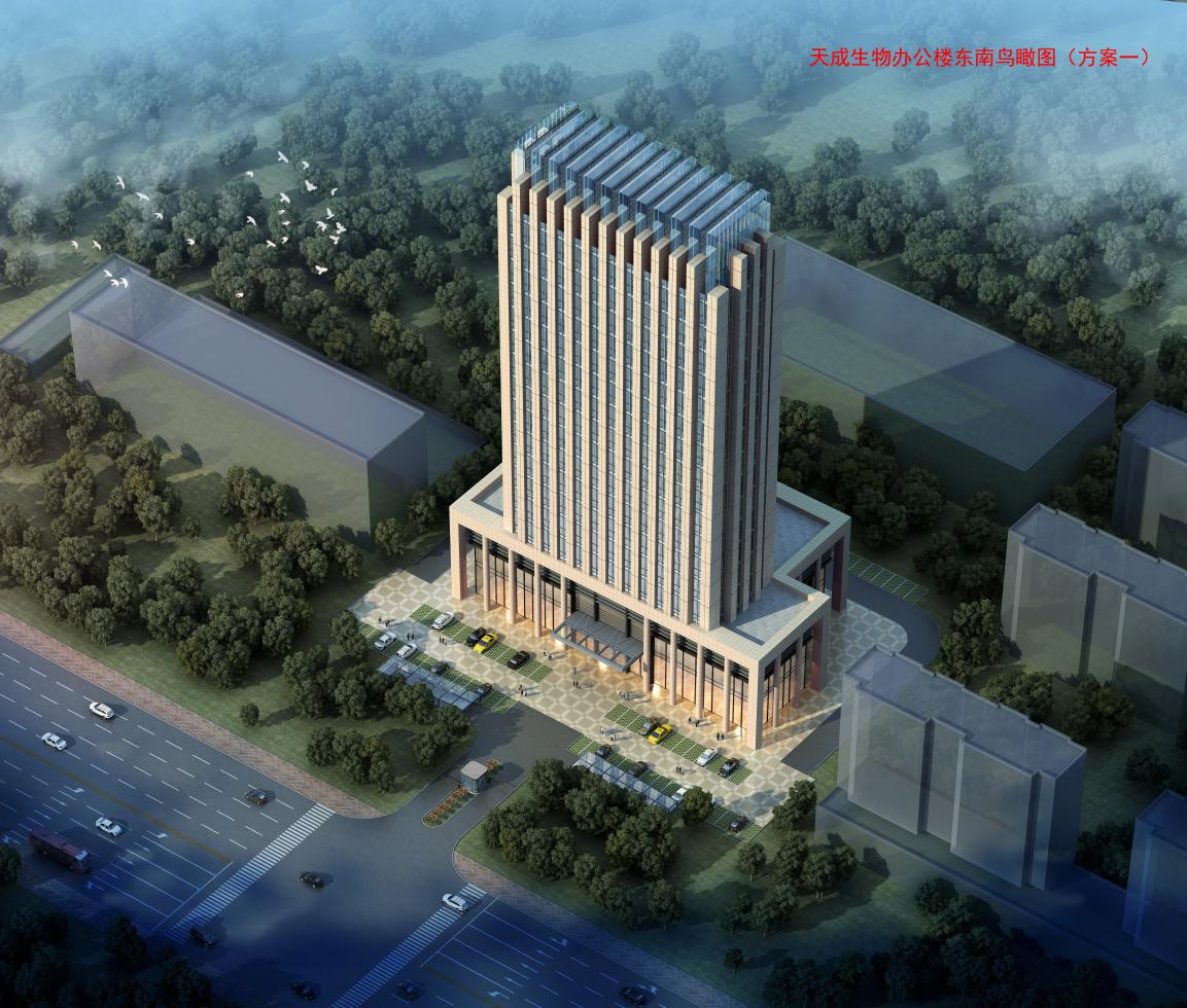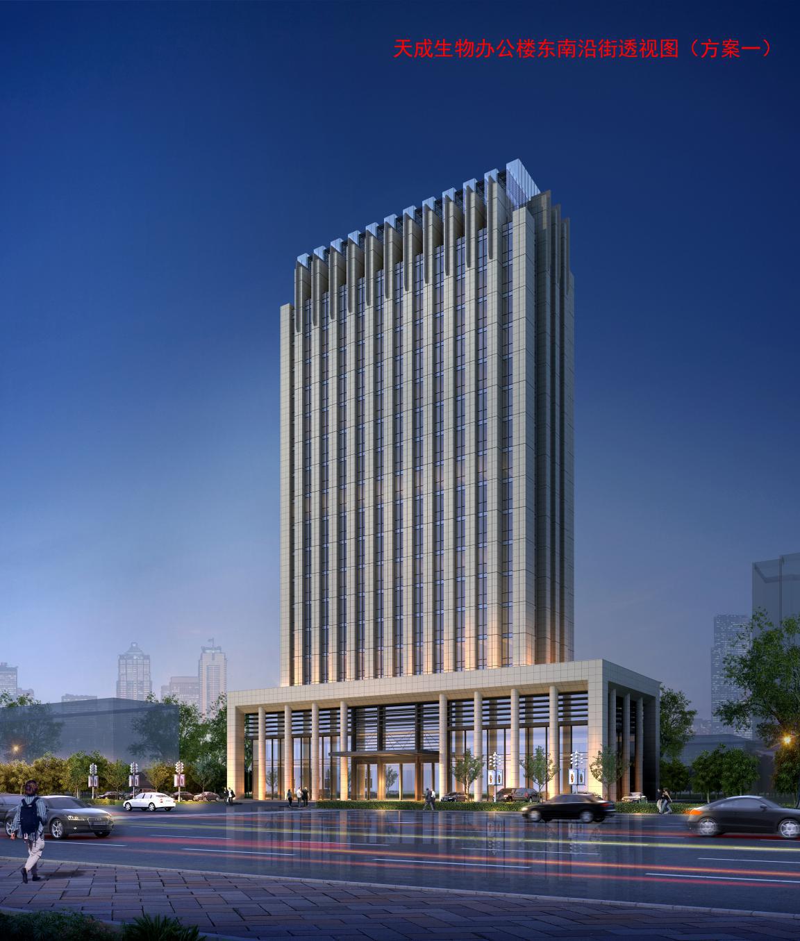 天成生物有限公司办公楼位于沂南县澳柯玛大道,规划面积有7445.2㎡,建筑面积26194.0㎡,地上17层地下1层,停车位规划二百五十多个,极大的满足了办公停车需求。甲方要求办公楼简洁实用,美观大方。所以规划设计时,规划设计师充分考虑到实用与建筑美观相结合,设计中使用简约风格。简约风格的特色是将设计的元素、色彩、照明、原材料简化到最少的程度,但对色彩、材料的质感要求很高。因此,简约的空间设计通常非常含蓄,往往能达到以简胜繁的效果。在主楼低层东、西、北三面向外延伸加建裙房,三个裙房成品字型环绕主楼把主楼围在中间,并在裙房最外部延边设置圆柱,使整个底部既美观又坚固。裙房使用玻璃挡墙,透光性好。主楼设计中添加了线条美,以线成面,突显出建筑的“肌肉”,线条从底部一直到顶部,笔直的耸立在那里。办公楼的顶部形成交错相隔,玻璃建筑与水泥建筑相融合,使得办公楼顶部完美收关。