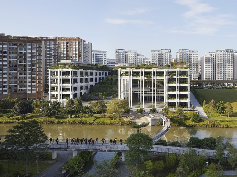 朝向水岸的风雨广场是社区中充满活力的核心地带,可以用于各种类型的社区活动和事件。广场连接了贯穿场地的东西向和南北向道路,同时与附近的Oasis轻轨站相连接,从而成为社区中重要的交通节点。建筑的每个立面都充斥着绿植,与环绕在餐厅和医院外部的凉廊共同在室内和室外之间形成一层“滤网”,使阳光和自然风柔和地透入内部空间,从而让整个建筑呈现出一种轻盈而开放的感觉。思锐建筑事务所的主创建筑师Christopher Lee表示:“我们的设计借鉴了新加坡住房和发展委员会在上世纪70-80年代开发的住宅建筑中常见的开放式框架,并基于景观环境将这种框架转变为一个更加轻盈和开放的、能够捕捉和容纳各类社区功能的系统——这是一座为社区生活的展开而打造的建筑。”